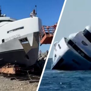 This is the jaw-dropping moment when a luxury yacht capsized and sank just moments after it launched for its maiden voyage. Staggering footage shows the fancy boat hitting trouble just…